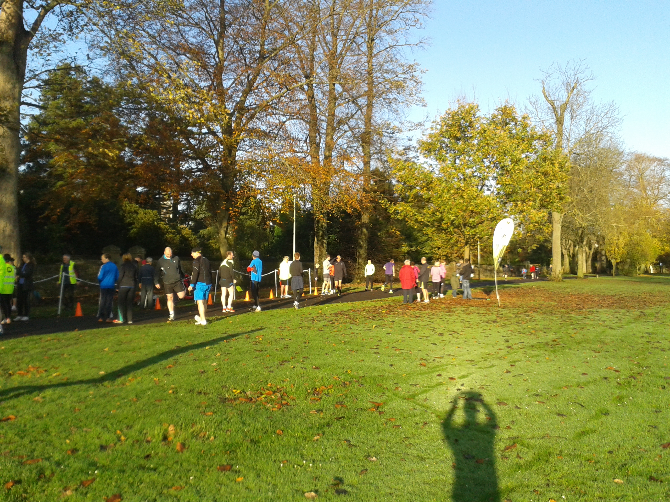 I’d underestimated the cold – meant to pack a long sleeved top to wear under my JogLisburn tee, but forgot. Luckliy enough I’d brought a lightweight Craghoppers cardi in white cotton, and wore that as a base layer. And of course it got covered in mucky paw prints when I said hello to a lovely Vizla, making her parkrun debut…